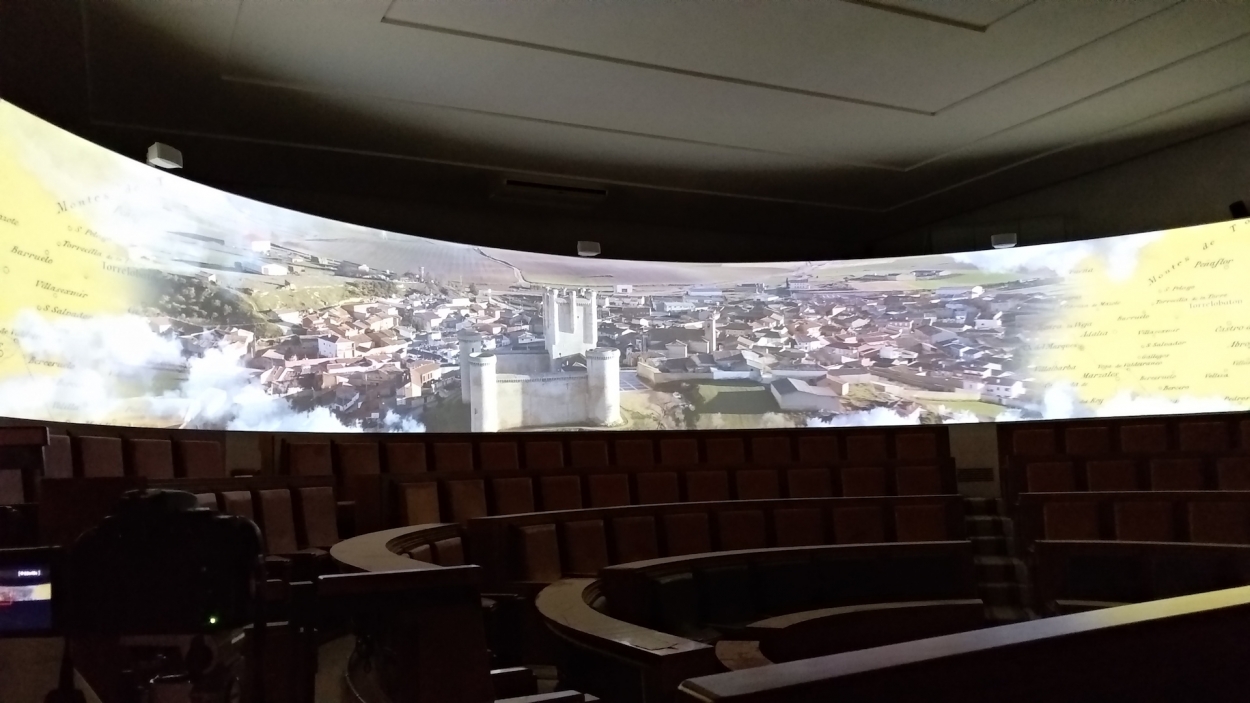 AV Inicio: Mapping en el hemiciclo del castillo relatando la historia del castillo de Fuensaldaña con imágenes de archivo, rodaje, 3D, ilustraciones. Proyección gran formato (40 m2).